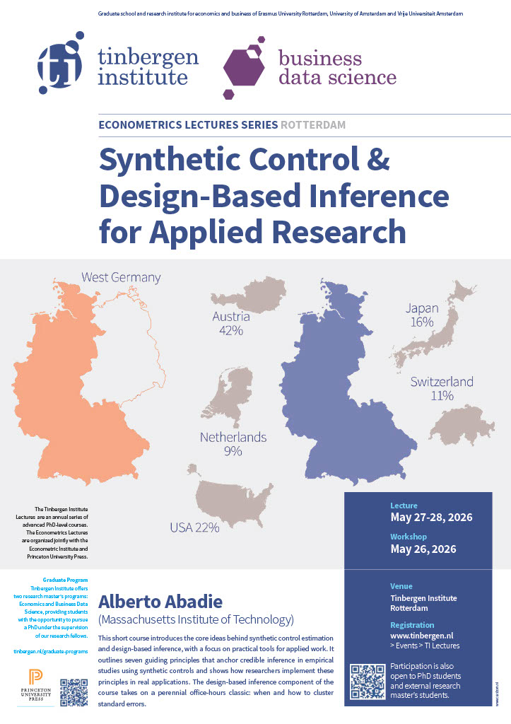 The Business Data Science (BDS) research master program at Tinbergen Institute is a joint initiative of the schools of economics and business of Erasmus University Rotterdam, the University of Amsterdam and Vrije Universiteit Amsterdam. The program ties the foundations of data science directly to different business fields: management science, operations analytics, quantitative finance and accounting.